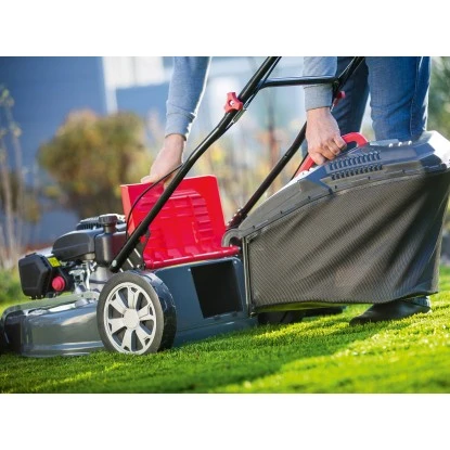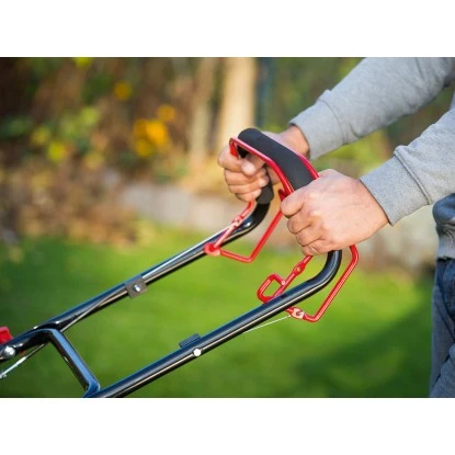 Der Rasenmäher besitzt einen höhenverstellbaren Holm, der zu Transportzwecken per Schnellverschluss zusammengeklappt werden kann. Mit dem ergonomisch geformten Handgriff mit Schaumstoffummantelung, erfolgt das Führen des Gerätes angenehm und komfortabel. Das Mulchkit ermöglicht ein Ausbringen von Schnittgut als Dünger auf den Rasen. Mit dem Fangsack werden die Rasenreste automatisch eingesammelt. Dank seines großen Volumens von 60 l muss er auch bei großen Flächen nur selten geleert werden.