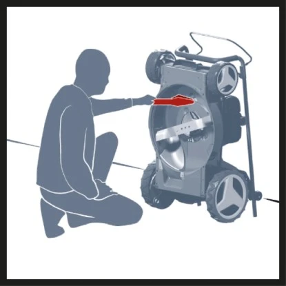 Der Mäher wird inklusive Reinigungsschaber zur Reinigung in der Reinigungsposition geliefert. Diese aufrechtstehende Reinigungsposition kann ebenfalls zur vergleichsweise sehr platzsparenden Lagerung des Rasenmähers genutzt werden.
