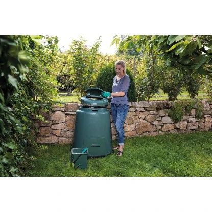 Der Deckel mit Sommer- und Winterstellung zur Regulierung der Belüftung sowie die gelochte Bodenplatte mit Luftkanal sorgen für ideale Temperaturverhältnisse, wodurch eine schnelle Kompostierung erreicht wird. Der Schnellkomposter ist UV- und witterungsstabil für eine lange Lebensdauer.