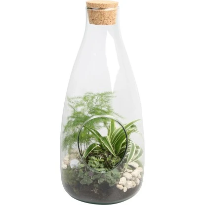 Wie ein kleines Terrarium wirkt dieses Arrangement, das mit Zierspargel (Asperagus Plumosis), Grünlilie (Chlorophytum laxum) und Schönpolster (Callisia „Turtle“) bepflanzt ist. Mit Moos und Steinchen dekoriert passt es ausgezeichnet zum modernen Lifestyle und Liebhaber vom botanischen Wohnen. Die Flasche hat auf der Rückseite eine Aussparung für bequeme Wassergabe.