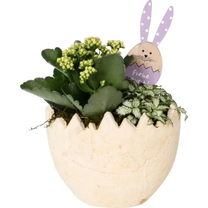Durch die Betonoptik des Übertopfes und den fröhlichen Hasen-Einstecker ist dieses Oster-Arrangement eine moderne Alternative zu klassischen Ostergestecken. Bepflanzt ist es mit einem gelb blühenden Flammenden Käthchen (Kalanchoe) und einer dekorativen Fittonie (Fittonia).
