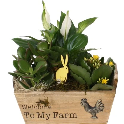 Dieses österliche Arrangement mit einer Kombination aus Blüh- und Grünpflanzen ist aufgrund des außergewöhnlichen Holz-Gefäß ein schöner Hingucker zur Frühlingszeit und eignet sich auch sehr gut als Geschenk zu Ostern. Die Pflanzen bevorzugen Zimmertemperatur und einen hellen Standort ohne direkte Mittagsonne. Bei regelmäßiger Wassergabe machen sie lange Freude. Während der Blüte einmal pro Monat düngen.